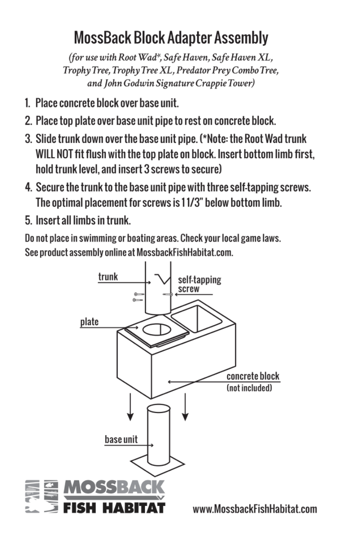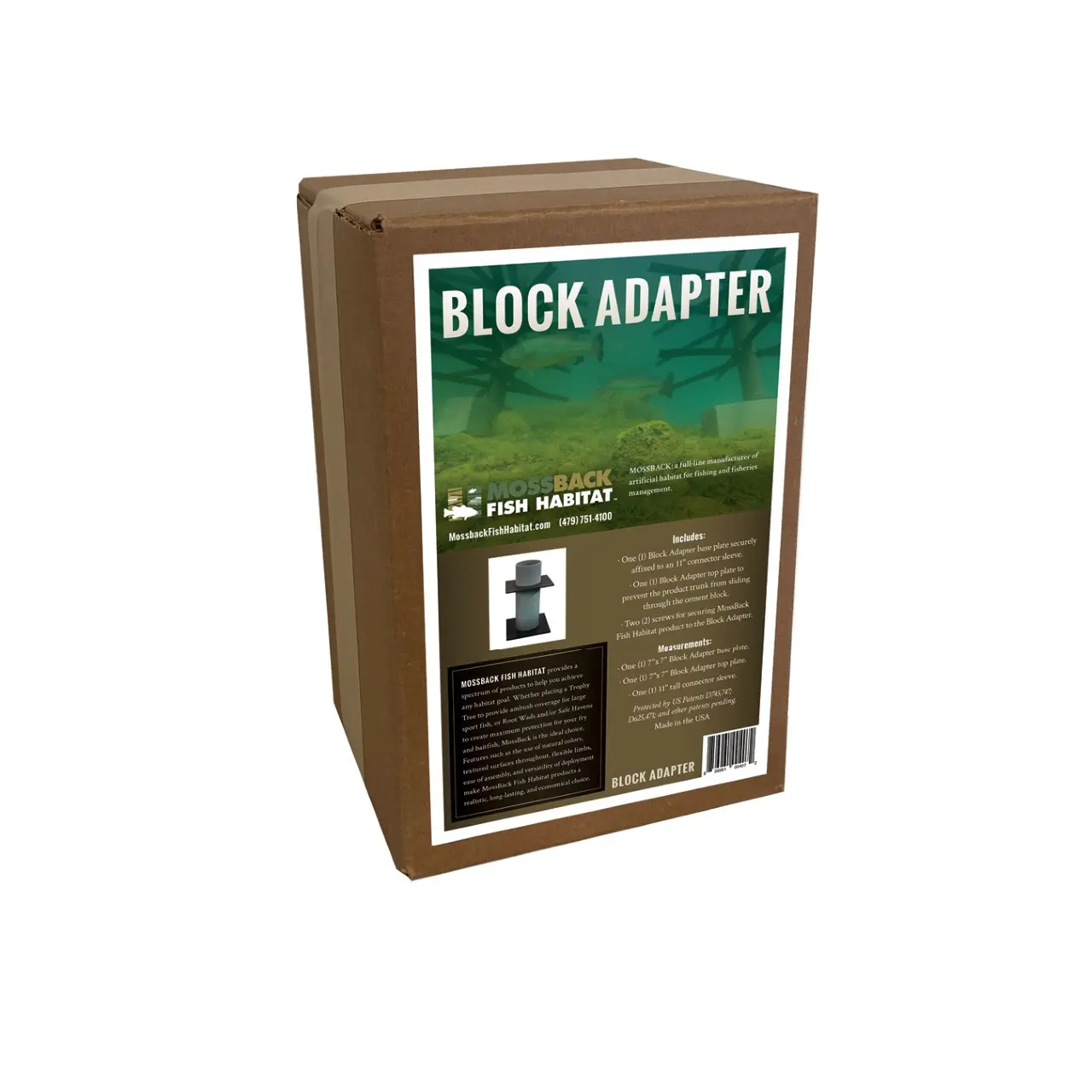 The MossBack Fish Habitat Concrete Block Adapter secures a half or full cement block to the base of individual MossBack products to permanently secure the habitat in place and helps to ensure vertical placement.