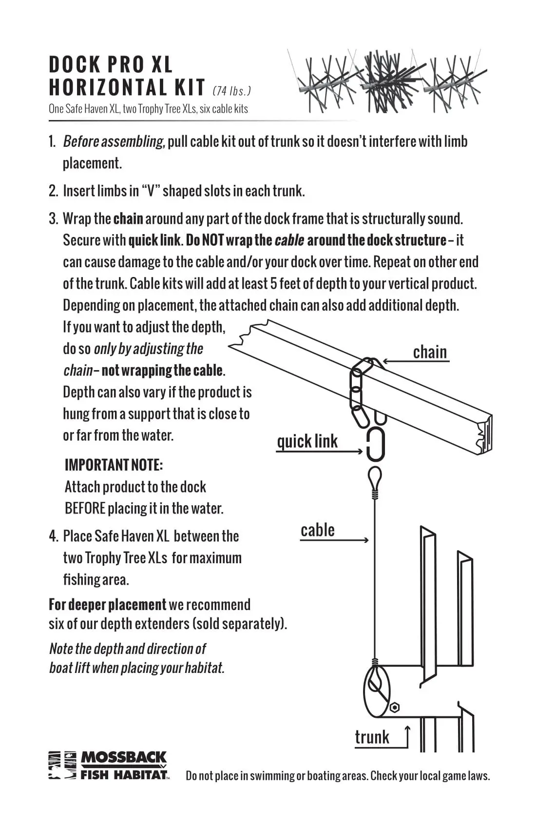 Dock Product Installation: Cable kits will add at least 5 feet of depth to your product, and the chain can add up to 27 inches. Chain can be adjusted to change depth. Please see instruction sheet for more placement information.