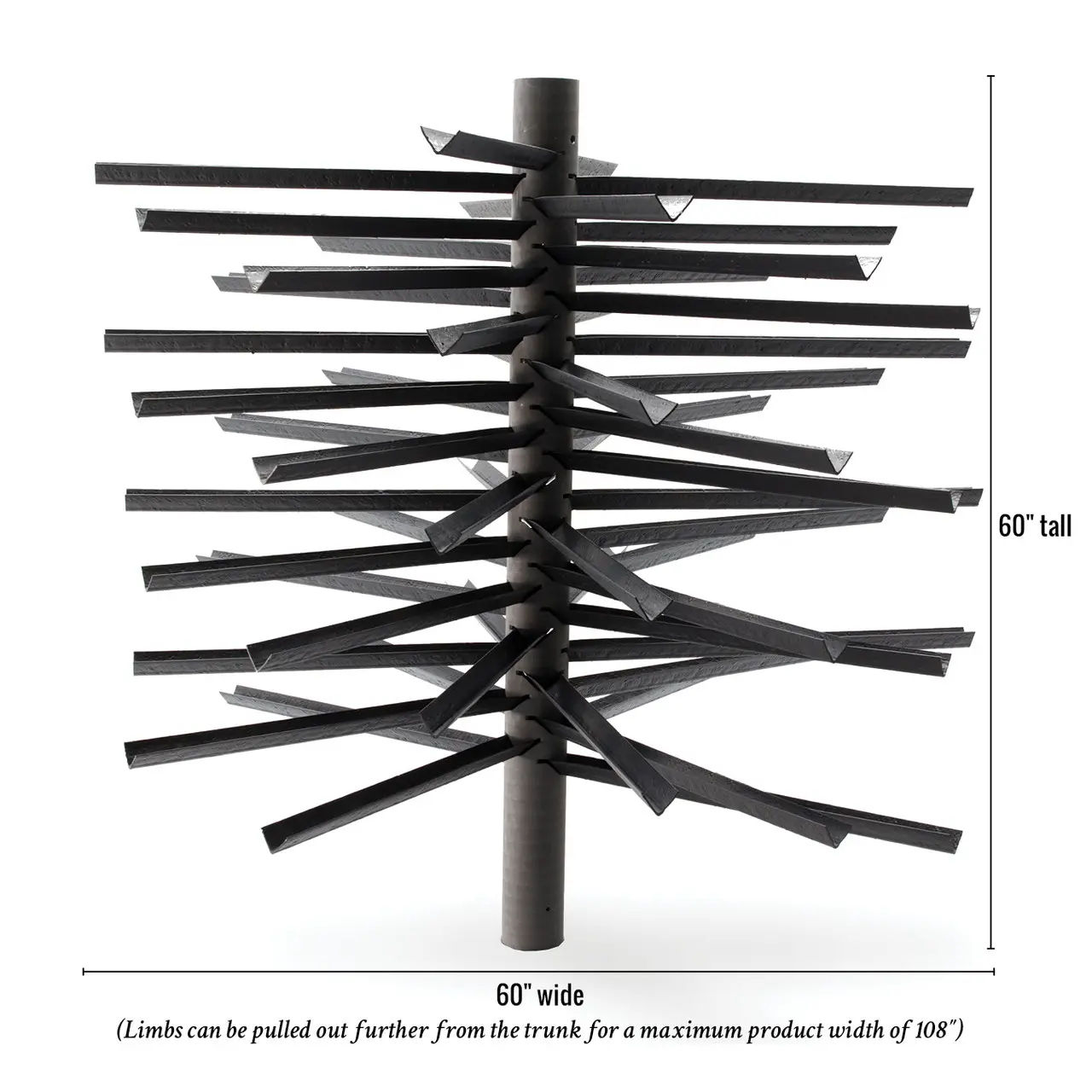 Width with evenly distributed limbs: 60 inches. Limbs can be pulled further from the trunk for a maximum product width of 108 inches. (Must leave a minimum of 4 inches of limb on one side of trunk.)